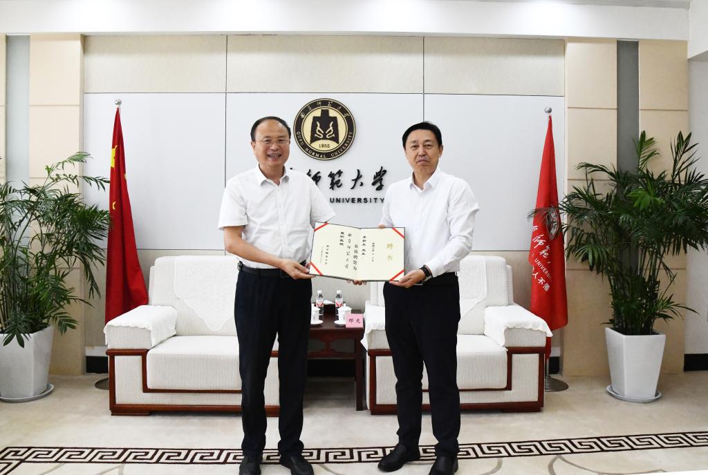 邢光对李新生一行表示欢迎,介绍了学校的发展历史、学科建设、人才培养等方面的情况。邢光表示,历城二中具有悠久的办学历史、深厚的文化底蕴、现代的教育理念、规范的学校管理、优质的教学资源,两校在学生思想政治教育、研究生实习实践、导师队伍遴选、学生就业等方面有着深厚的合作。李新生介绍了历城二中的办学特色和鲜明的育人模式,他表示作为校友对母校有着深厚的感情,愿意一如既往的支持母校,与母校同频共振,同进步、共发展。张洪海向李新生及历城二中长期以来学校的支持表示感谢,并为李新生颁发了学校兼职教授聘书。