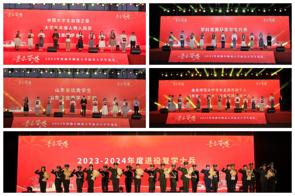 巡礼活动中,全体人员共同观看了2023年曲园学子在学业发展、创新创业、志愿服务、社会实践、技能锻炼等方面奖项获奖代表的宣传片,出席活动的领导老师为中国大学生自强之星、第十八届大学生年度人物入围奖、国家奖学金、山东省优秀学生、山东省优秀学生干部、山东省优秀毕业生、高质量就业学生代表、米兰网青年五四先进个人、山东省三下乡社会实践先进个人代表颁奖,学生代表为退役复学大学生士兵代表献花。