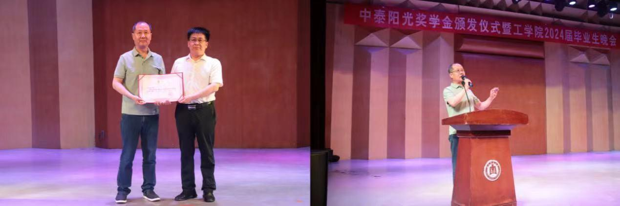 曲阜师大工学院讯 6月11日晚,曲阜师大工学院于音乐厅举办中泰阳光奖学金颁发仪式暨学院2024届毕业生晚会。学校党委常委、副校长胡凡刚,山东中泰阳光集团董事长牟建出席颁发仪式。