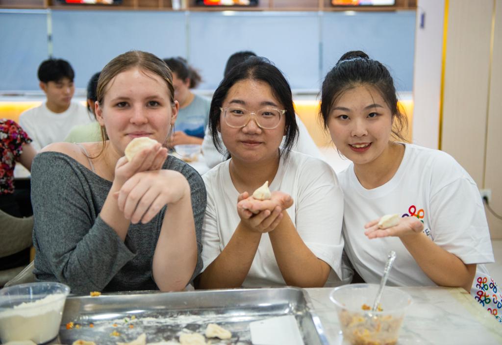随后,中美学生共聚齐风餐厅体验包饺子。在曲阜师大学生手把手指导下,美国青年从揉面到擀皮再到包馅,忙得不亦乐乎。这一过程既促进了双方青年之间的友好交流,又让他们感受到中国博大精深的饮食文化。晚餐时,同学们一边品尝自己包的水饺和各种美味菜肴,一边载歌载舞,展示各自的才艺,现场氛围更加活跃。中国学生带来优美的舞蹈和动人的歌曲表演,美国青年则以欢快的节奏起舞,将现场气氛推向高潮。活动在欢声笑语中接近尾声,中美青年依依不舍地告别,并合影留念。