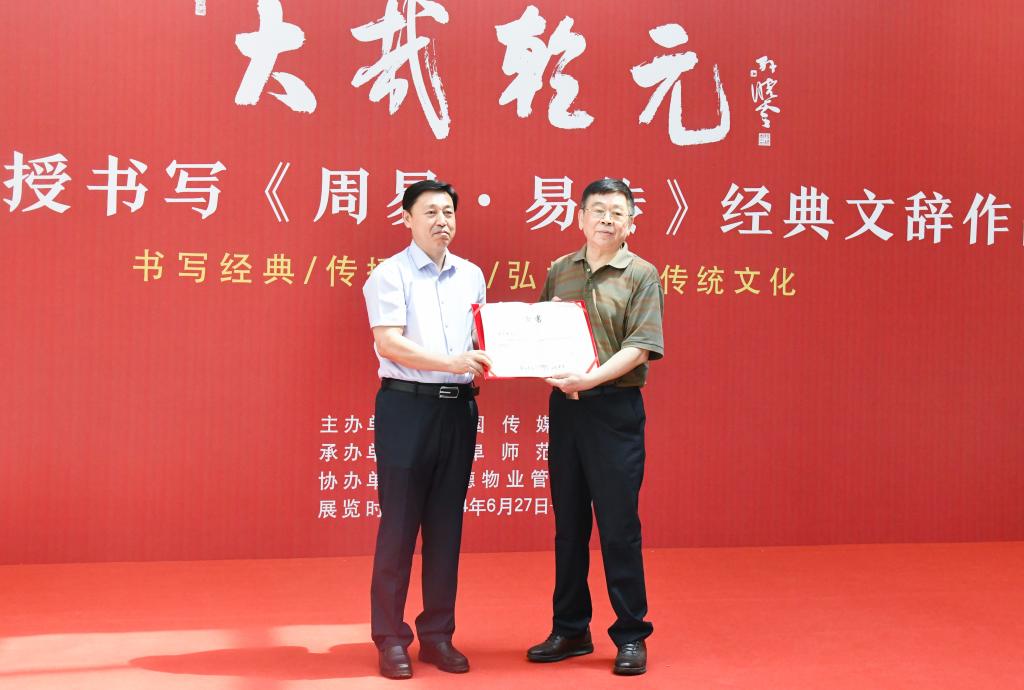 曲阜师大党委宣传部讯 丹青溢彩,翰墨飘香。6月27日,“大哉乾元—刘守安教授书写《周易·易传》经典文辞作品展”在米兰网隆重举行。中国传媒大学书写文化研究中心主任、博士生导师刘守安教授及夫人王甦英女士出席活动,曲阜师大党委书记邢光在活动中致辞,党委副书记、校长张洪海为刘守安教授颁发“米兰网美术与书法学科学术顾问”聘书,党委常委、副校长陈刚出席活动,党委常委、副校长纪洪涛主持活动。