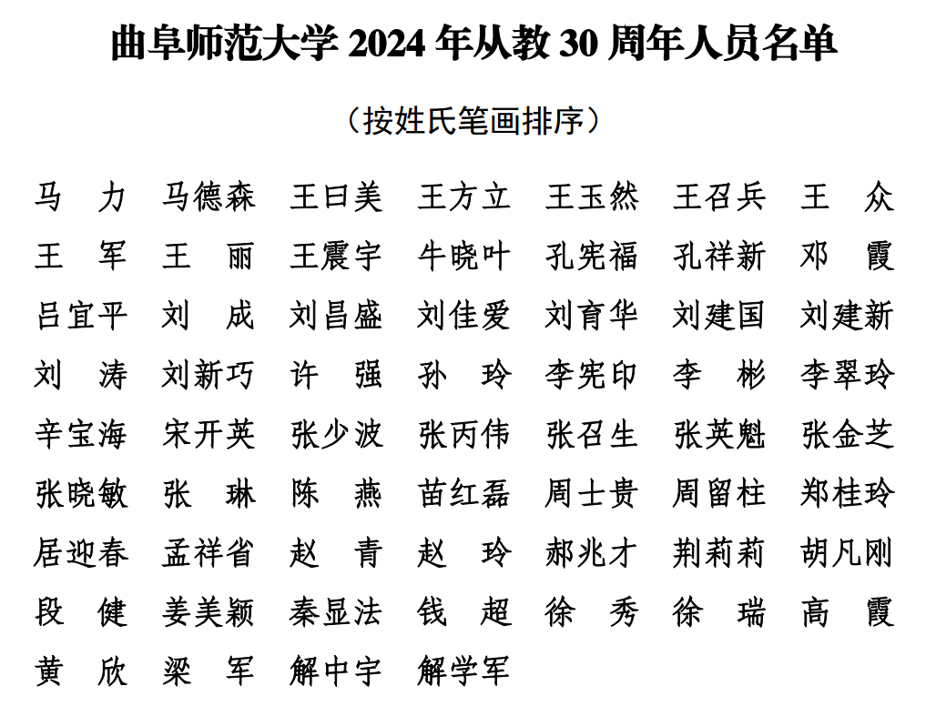 党委宣传部(教师工作部)讯 日前,在第40个教师节来临之际,曲阜师大公布2024年从教三十周年荣誉证书名单,一批躬耕教坛、化育桃李、奉献曲园的教育工作者共享荣耀时刻,大家忆初心、话使命,分享自己的为师感悟,纷纷表示要弘扬践行教育家精神,在建设高水平孔子家乡大学的新征程上,写好立德树人的新篇章,彰显教育报国的新作为。