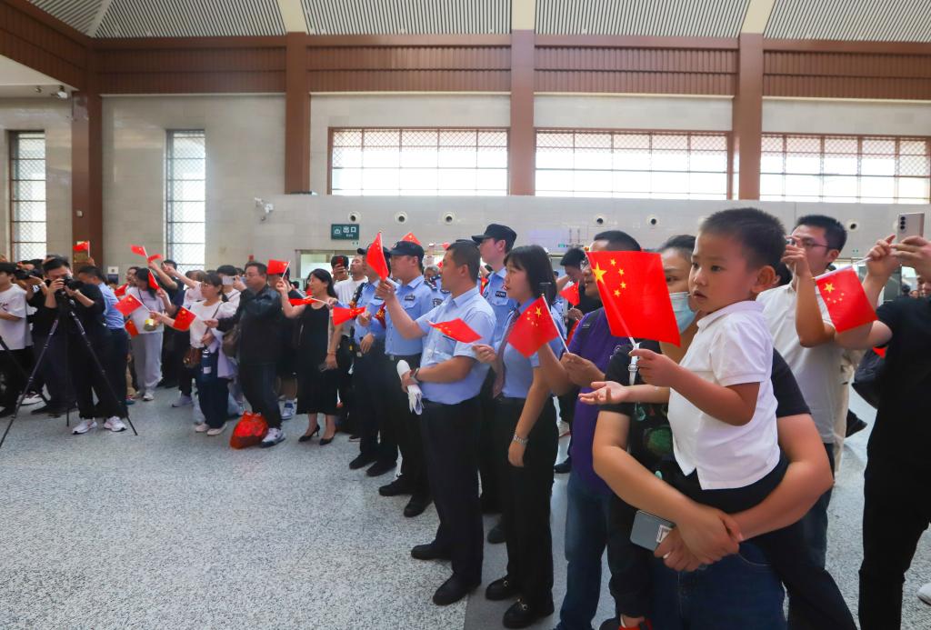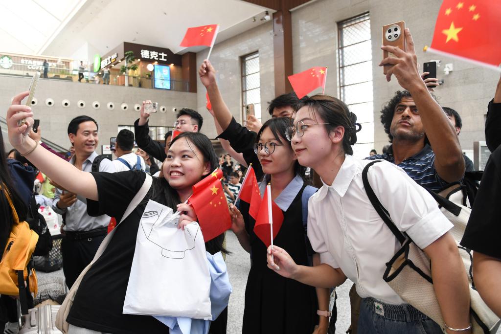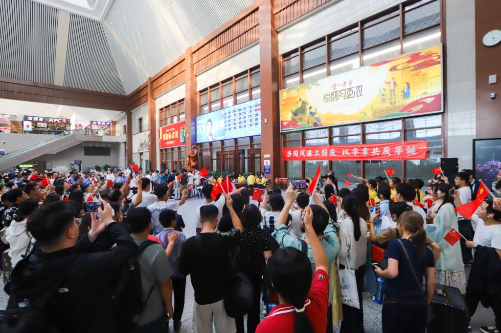 “这是一面去年教师节当天曾在天安门广场升起的国旗。”当曲阜师大国旗护卫队的同学们在现场高举巨幅鲜艳国旗走进人群,旅客们纷纷上前与国旗合影,定格下一张张为强国建设、民族复兴而自豪的幸福笑脸,并在现场准备的许愿卡上写下“致祖国的一封信”,抒发强国有我的奋斗之志、表达爱我中华的美好祝福。