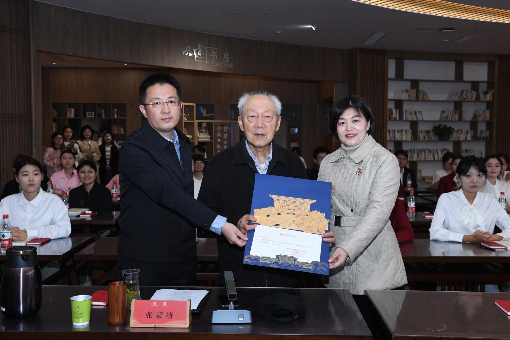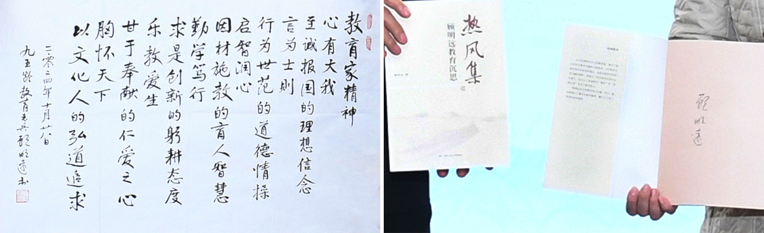 活动伊始,曲阜师大党委常委、宣传部部长、教师博物馆馆长孙祥广和山东大学国际教育学院院长马晓乐共同展示了顾明远书写的教育家精神手稿及签名著作,向张顺清敬呈“第一班主任”聘书。