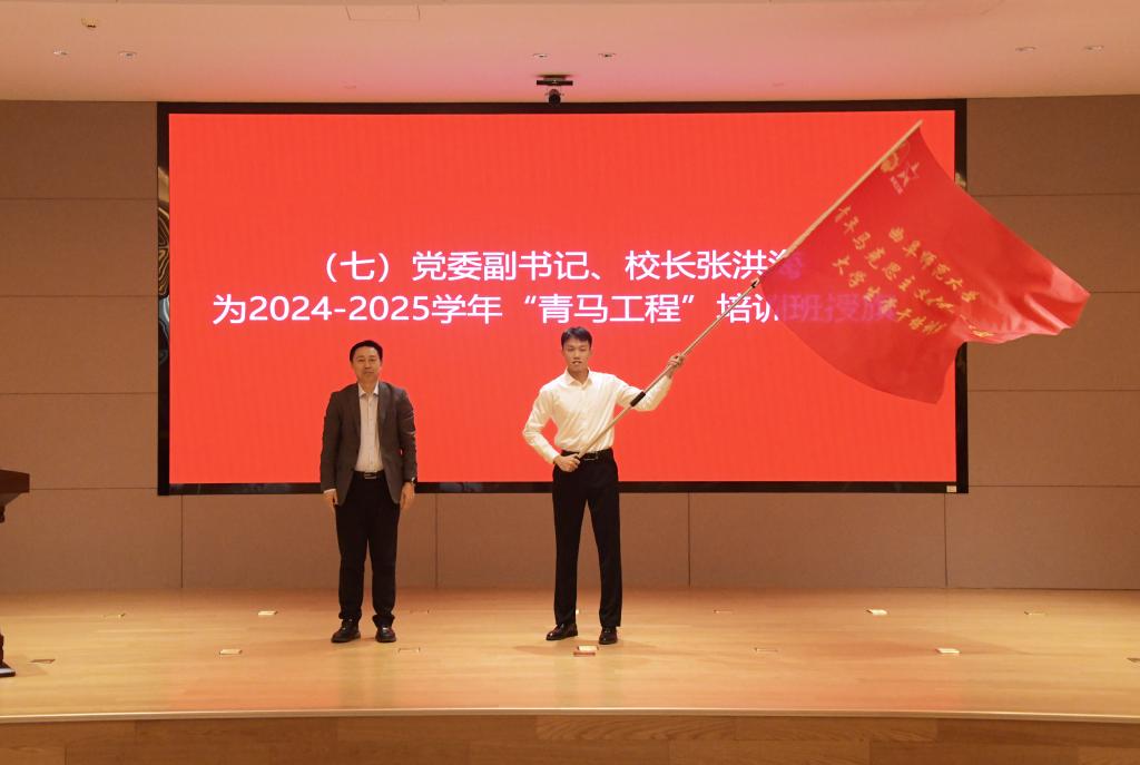 仪式上,教务处处长李傅山为2023—2024学年“青马工程”培训班学员代表颁发优秀学员证书,学生工作处处长姜美颖宣读了2024—2025学年“青马工程”培训方案。本次“青马工程”培训分启明班、先锋班、卓越班三个层级实施,设有弘毅、敏行、明德、博雅、犁耕、美茂理论“六堂”以及实践课堂。学校团委相关负责同志从高质量实施顶层设计、高标准构建培养体系、高品质打造活动品牌、高规格培育青年政治骨干四个方面介绍了学校“青马工程”总体实施情况。学员代表郑淑轩在发言中表示要坚定不移听党话、跟党走,成长为新时代合格的青年马克思主义者。