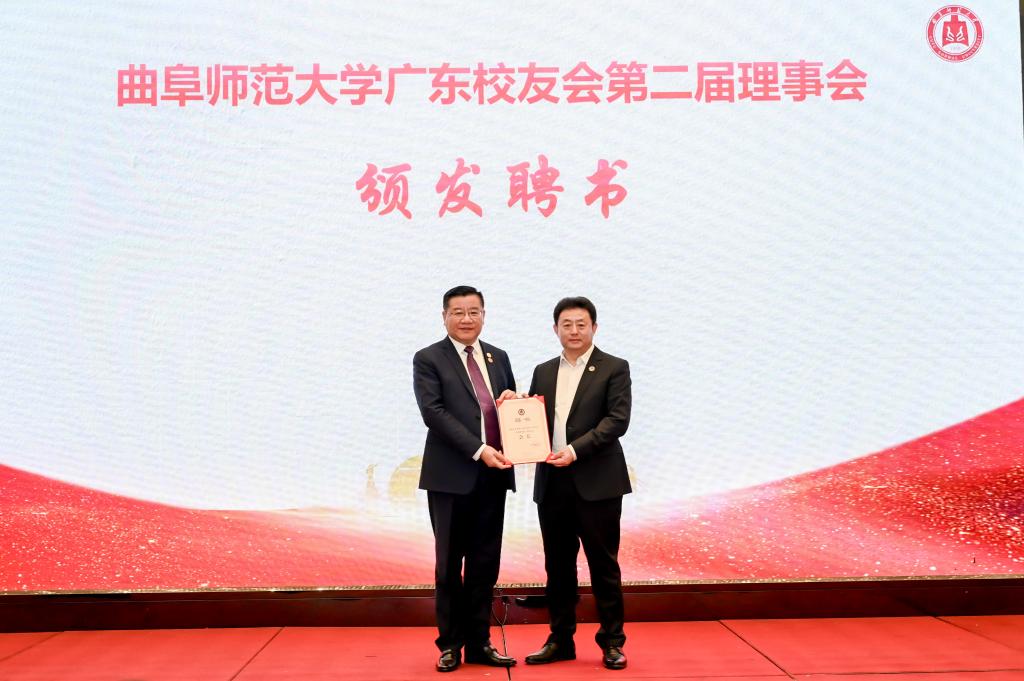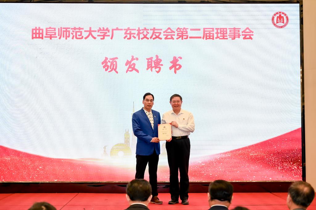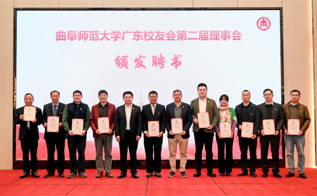 纪洪涛与刘德明共同为广东校友企业联盟揭牌并向第二届理事会会长、副会长颁发了聘书,并向通过米兰网孔子教育基金会向母校捐款6万元的政治1983级校友王海传赠送了捐赠证书。国内合作处处长、校友会秘书长孔宪福向第二届理事会秘书长、副秘书长颁发了聘书。学校相关学院党委书记分别与各分会会长共同为分会揭牌,并向会长、副会长、秘书长颁发了聘书。