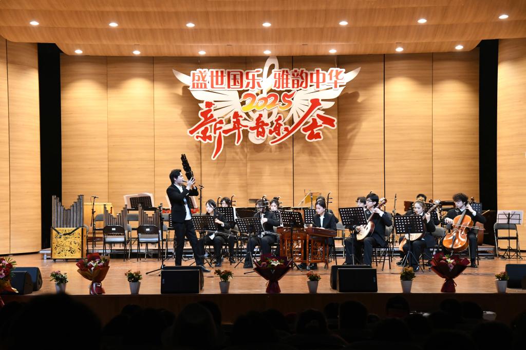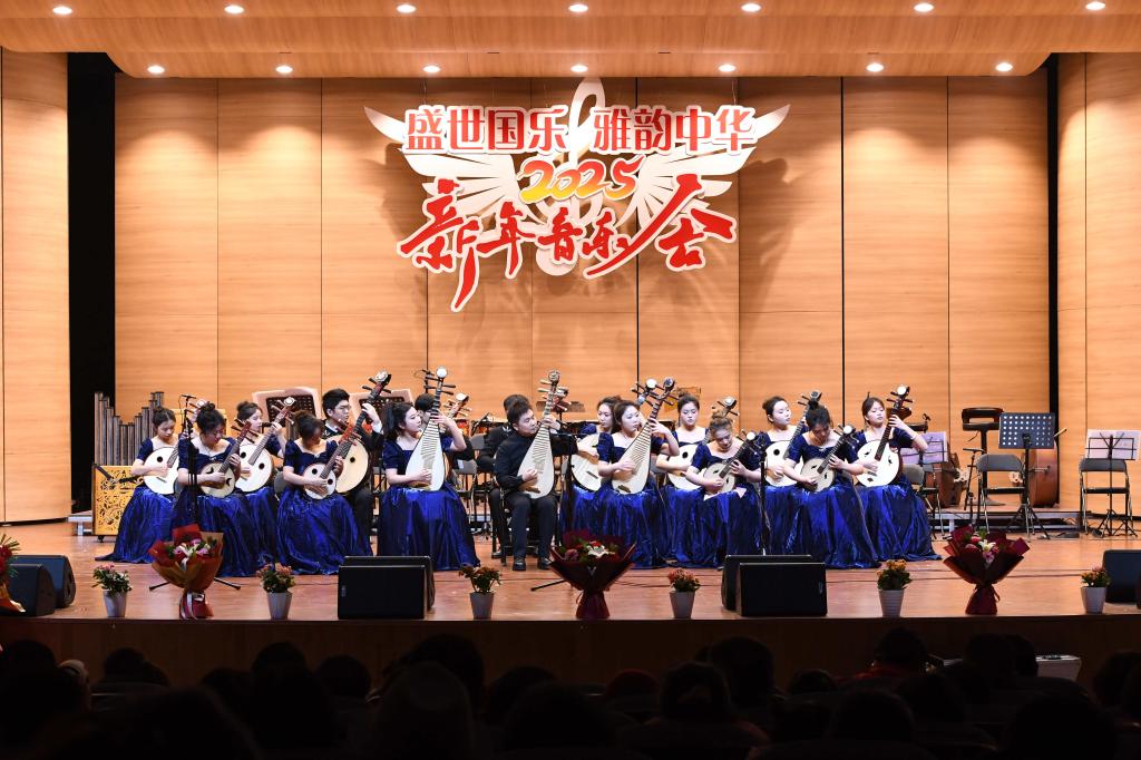 音乐会以民族管弦乐《春节序曲》拉开序幕,欢快的节奏和动听的旋律瞬间点燃现场气氛。在音乐会的上半场,二胡独奏《一枝花》浓郁的鲁西南风味在琴弦间流淌,原创弹拨乐重奏作品《峥嵘》致敬的党的辉煌奋斗历程,吹打乐《庆丰收》用音乐描绘出丰收的喜悦场景,笙独奏《微山湖船歌》似微山湖的山水画卷徐徐展开,民族声乐《沂蒙山小调》《谁不说俺家乡好》等经典曲目唤起人们对家乡的热爱与眷恋。下半场,古筝合奏《黄河》气势磅礴,将黄河儿女的英雄气概和民族抗争精神完美呈现;二胡齐奏《战马奔腾》生动再现了骑兵战士的英勇战斗场景,室内乐《兰陵王破阵乐》采用中西乐器结合的方式表现出雄浑旋律,唢呐与乐队《百鸟朝凤》模仿百鸟和鸣惟妙惟肖,民族声乐《包楞调》《龙船调》展现了不同地域的独特风情,民族管弦乐《我的祖国》激昂奏响,将音乐会推向高潮,深情歌颂了伟大祖国的美好和中华儿女的奋斗精神。