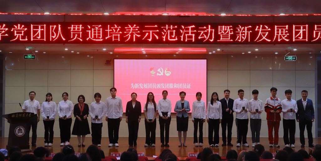 李志红代表学校党委向光荣加入中国共产主义青年团的同学表示祝贺,并对全体团员青年提出了三点希望:一是坚定理想信念,做“胸怀家国”的有志青年。要牢记习近平总书记对新时代中国青年的殷切嘱托,坚定理想信念,厚植家国情怀,练就过硬本领,发扬奋斗精神,在人身政治“接力跑”中兑现“请党放心,强国有我”的誓言。二是陶冶道德情操,做“心有清风”的有德青年。要严格遵纪守法,认真履行团员义务,当好党的助手和后备军,用中华优秀传统文化、革命文化、社会主义先进文化培根铸魂、启智润心,在激荡的思潮涌动中明辨是非、恪守正道。三是锤炼扎实学识,做“腹有诗书”的有识青年。要刻苦学习、努力钻研,将读“有字之书”与学“无字之书”结合起来,在科技创新、乡村振兴、服务社会等广阔天地中有所作为,向下扎根,向上生长。