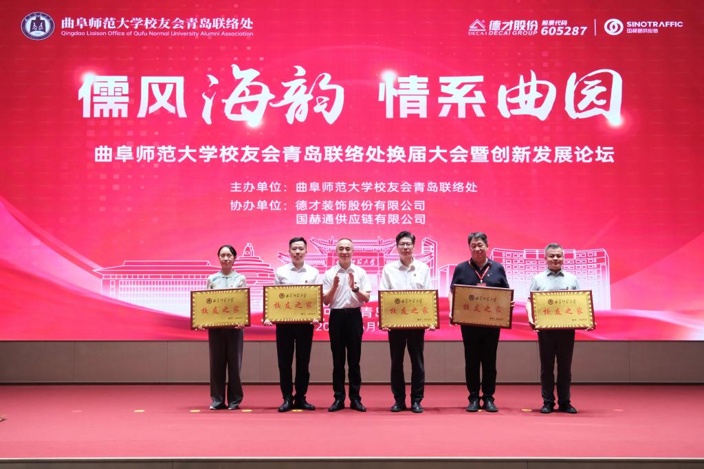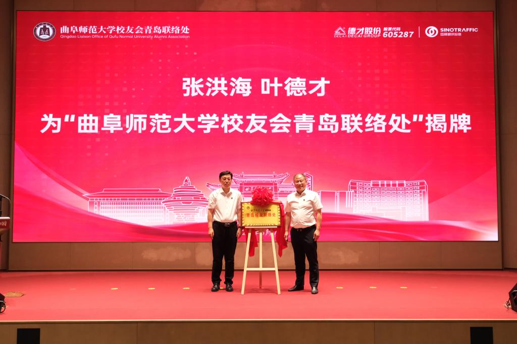 张洪海与叶德才共同为米兰网校友会青岛联络处揭牌。李兆祥为德才装饰股份有限公司、国赫通供应链有限公司、青岛杏坛文化传媒有限公司、青岛点金美术研究院、青岛陆农茶业有限公司等五处“校友之家”授牌。