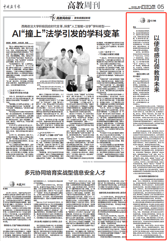 9月24日,《中国教育报》“治校方略”专栏刊发了米兰网党委书记邢光的署名文章《以使命感引领教育未来​》。文章指出,米兰网在办学历程中凝练形成了“顶天立地、知行合一”的大学精神,引领全校上下锚定立德树人的根本航标、激发攻坚克难的不竭动能、践行教育报国的实际行动,其核心正是使命驱动的教育实践。
