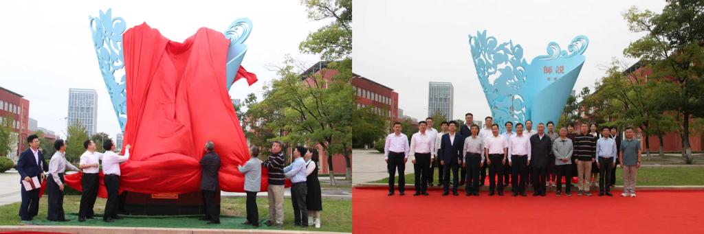 仪式上,国赫通供应链公司董事长孙赫宏代表青岛校友会致辞。他介绍,雕塑以展开的书卷为型,镌刻的《师说》既呼应儒学圣地的文化根脉,又与母校“学而不厌,诲人不倦”的校训深度契合;书页间点缀的桃李图案,代表母校桃李满园的育人成就。雕塑是连接“曲园魂”与“青岛情”的见证。青岛校友会将继续发挥积极作用,推动青岛校友企业与母校相关学科团队开展深度联动合作,让曲园智慧与校友力量同频共振、双向赋能。