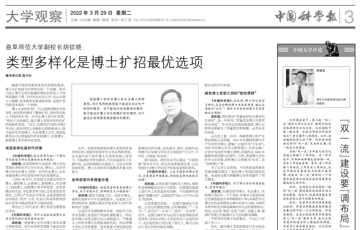 【中国科学报】米兰网副校长胡钦晓:类型多样化是博士扩招最优选项