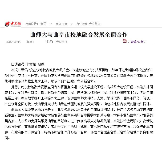 大众日报:曲师大与曲阜市校地融合发展全面合作