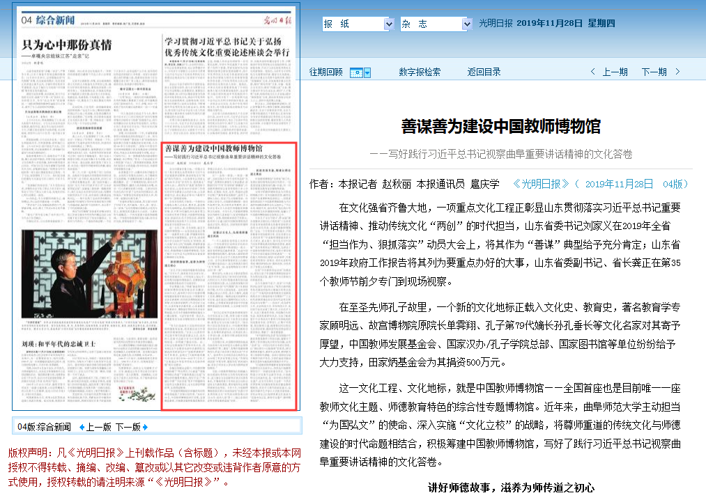 “在孔子家乡树起师德教育的新高地。”今年9月,国务院学位办原主任、教育部原副部长、中科院院士赵沁平,在参观中国教师博物馆后,对博物馆突出师德教育特色给予高度评价。