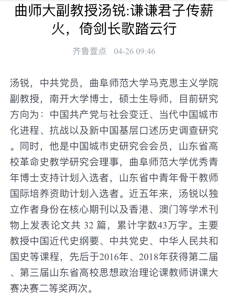 齐鲁晚报·齐鲁壹点报道我校思政课教师汤锐副教授