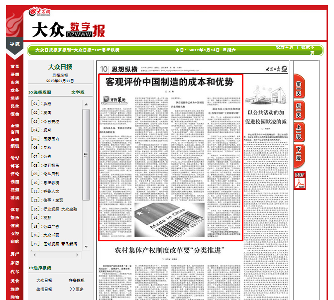 大众日报:刘刚《客观评价中国制造的成本和优势》