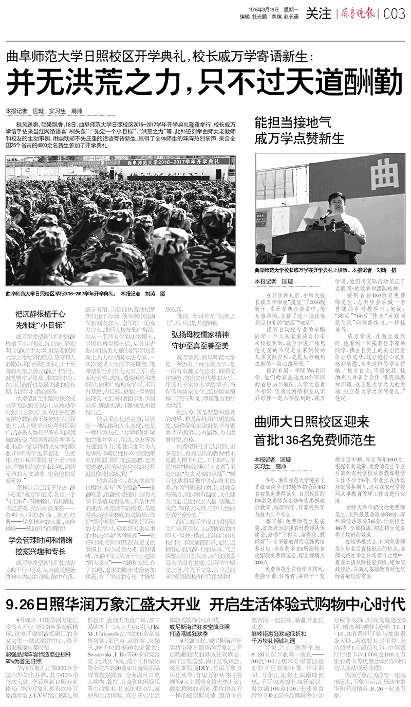 齐鲁晚报:米兰网开学典礼 校长戚万学寄语新生