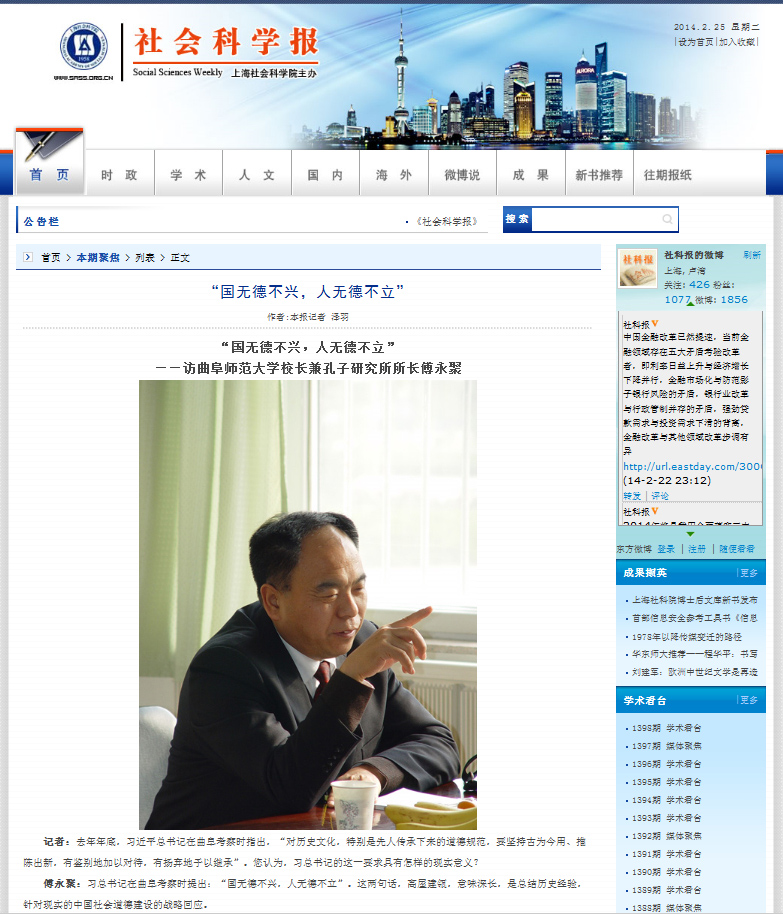 近日,《社会科学报》第1397期在头版以“国无德不兴,人无德不立”为题,对我校校长兼孔子研究所所长傅永聚教授进行专访,在社会上引起强烈反响。以下为报道全文: