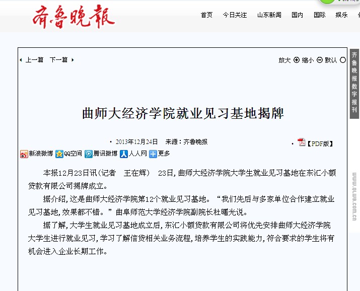 齐鲁晚报:曲师大经济学院就业见习基地揭牌