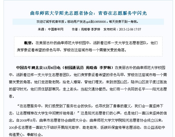 中国青年网:米兰网阳光志愿者协会:青春在志愿服务中闪光