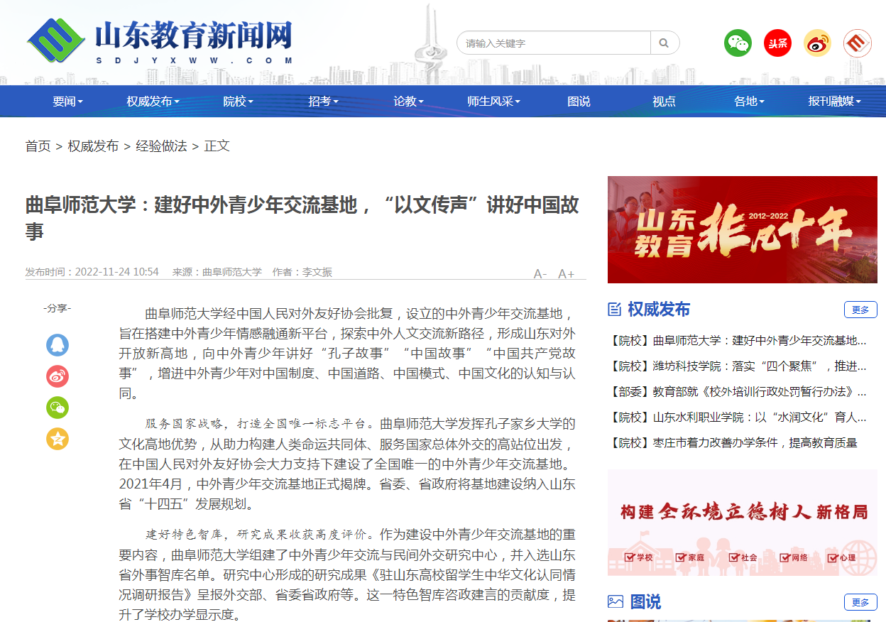 【山东教育新闻网】米兰网:建好中外青少年交流基地,“以文传声”讲好中国故事