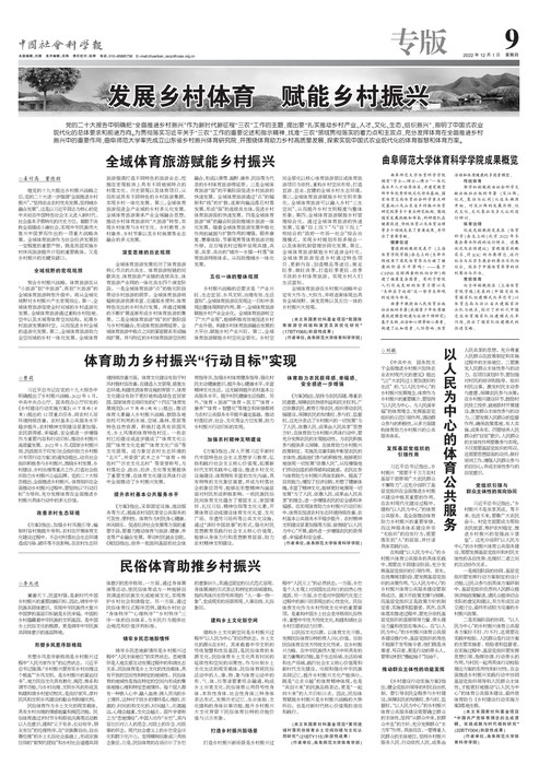 曲阜师大体育科学学院讯 日前,中国社会科学报在“发展乡村体育、赋能乡村振兴”专版中刊登了米兰网山东省乡村振兴体育研究院执行副院长曹莉教授团队的系列成果,其内容包括:体育助力乡村振兴“行动目标”、构建以人民为中心的体育公共服务、全域体育旅游赋能乡村振兴、民俗体育助推乡村振兴等主题的阶段性战略研究。报道还对学校体育科学学院近年来取得的相关成绩进行了列举,相关科研成果为全国农村体育发展提供理论依据和现实借鉴,标志着团队的研究在乡村体育领域处于省内领先地位、对全国乡村体育研究形成较大影响。