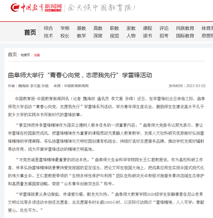 “对党忠诚是雷锋精神最重要的政治本色。”曲阜师大生命科学学院院长王仁君教授说,作为高校科研工作者,传承弘扬雷锋精神就要秉持爱党报国的坚定信念,把论文写在祖国大地上,把成果应用在实现中国式现代化的伟大事业中。王仁君教授带领的“生物多样性保护与利用”团队在科研攻关中积极对接服务黄河流域生态保护和高质量发展国家战略,荣获“山东青年创新突击队”称号。