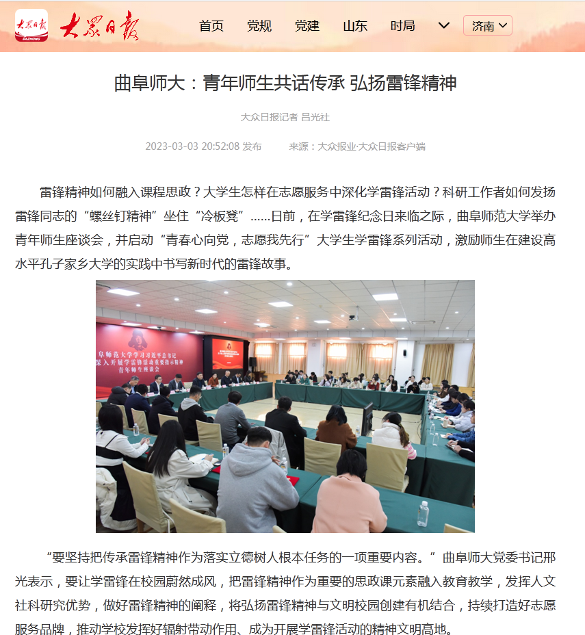 雷锋精神如何融入课程思政?大学生怎样在志愿服务中深化学雷锋活动?科研工作者如何发扬雷锋同志的“螺丝钉精神”坐住“冷板凳”……日前,在学雷锋纪念日来临之际,米兰网举办青年师生座谈会,并启动“青春心向党,志愿我先行”大学生学雷锋系列活动,激励师生在建设高水平孔子家乡大学的实践中书写新时代的雷锋故事。