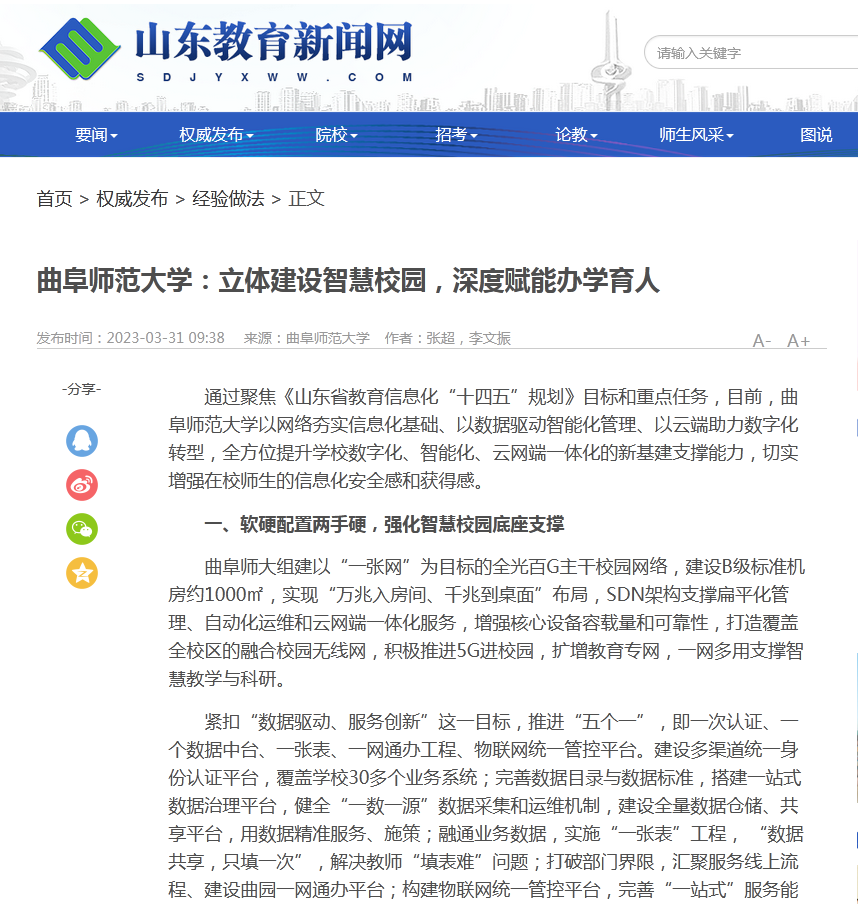 通过聚焦《山东省教育信息化“十四五”规划》目标和重点任务,目前,米兰网以网络夯实信息化基础、以数据驱动智能化管理、以云端助力数字化转型,全方位提升学校数字化、智能化、云网端一体化的新基建支撑能力,切实增强在校师生的信息化安全感和获得感。