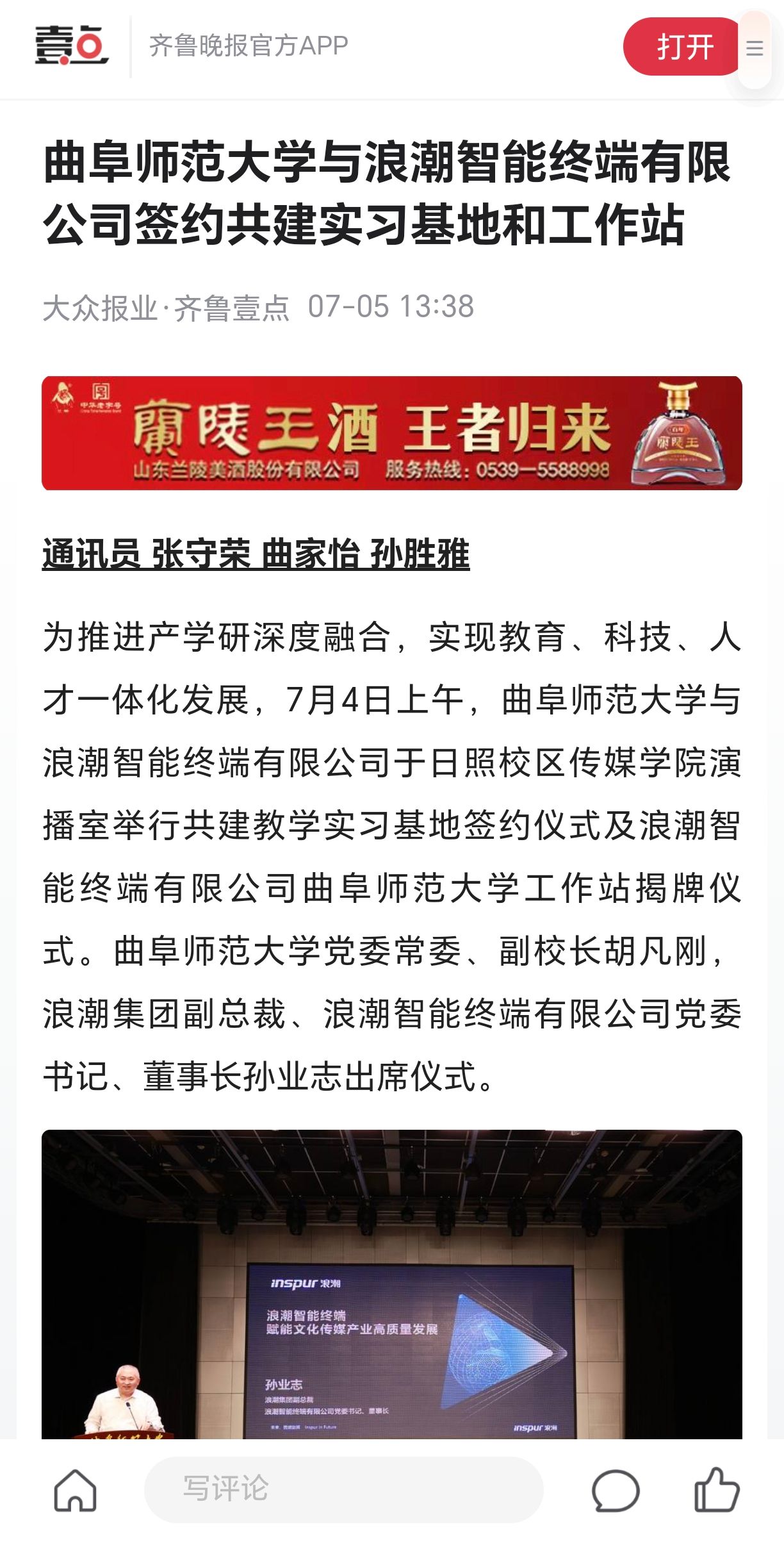 【齐鲁晚报·齐鲁壹点】米兰网与浪潮智能终端有限公司签约共建实习基地和工作站