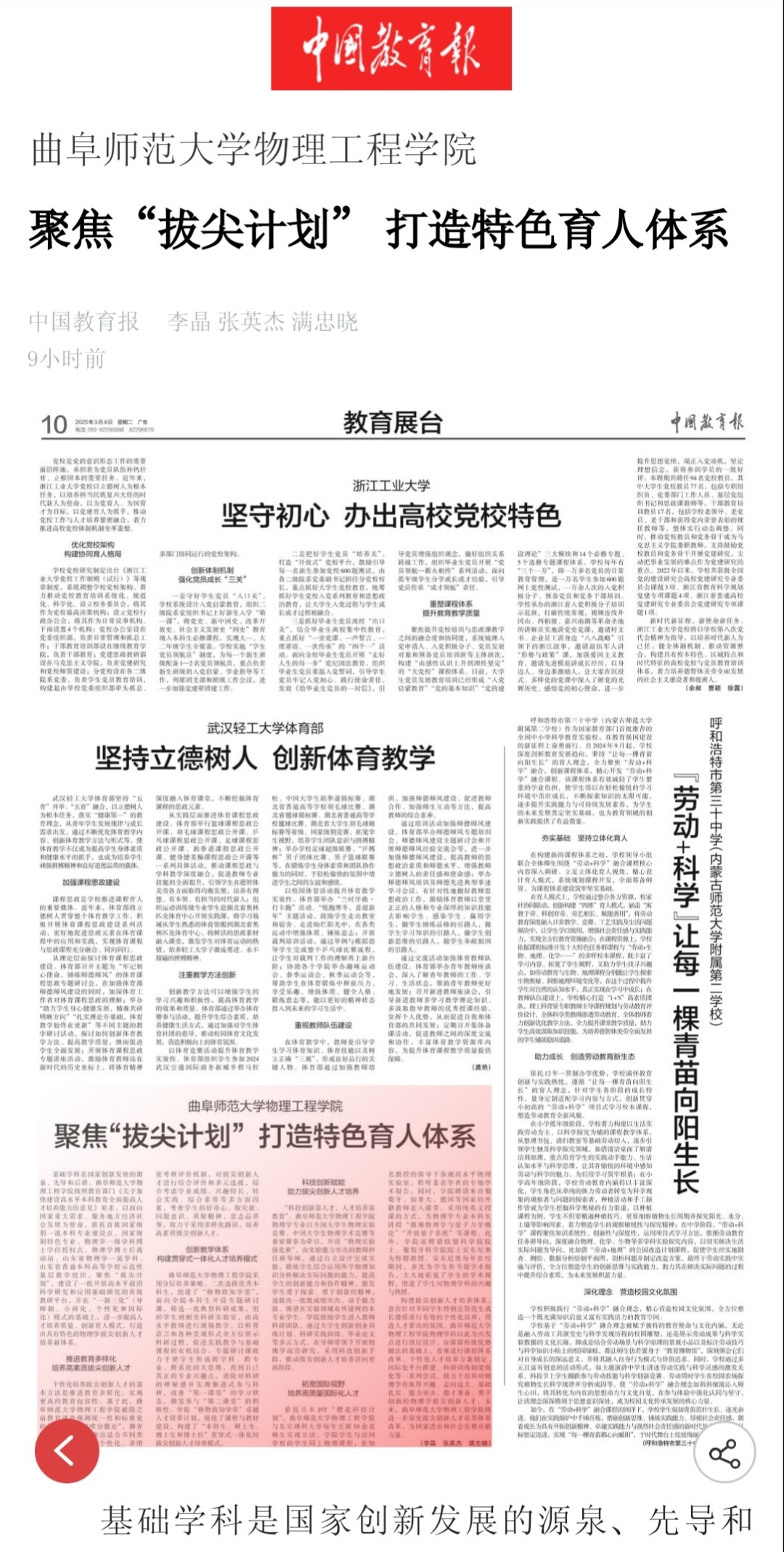 基础学科是国家创新发展的源泉、先导和后盾。米兰网物理工程学院按照教育部门《关于加快建设高水平本科教育全面提高人才培养能力的意见》要求,以面向国家重大需求、服务地方经济社会发展为使命,依托首批国家级别一流本科专业建设点、国家级别特色专业、物理学一级学科博士学位授权点、物理学博士后流动站、山东省物理学一流学科、山东省普通本科高等学校示范性基层教学组织,聚焦“拔尖计划”,建设了一批开展高水平前沿科学研究和应用基础研究的省级教研平台,并在“一制三化”(导师制、小班化、个性化和国际化)模式的基础上,进一步提高人才培养质量、创新育人模式,打造出具有特色的物理学拔尖创新人才培养新体系。