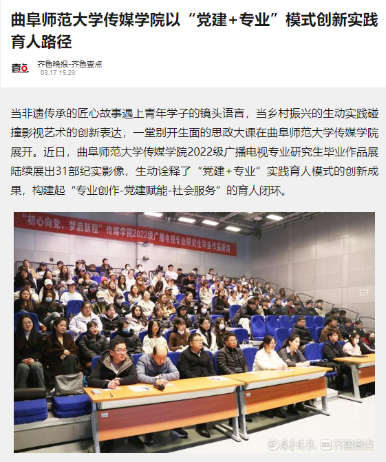此次展演作为传媒学院深化“三全育人”综合改革的重要举措,创新构建“三维联动”育人机制:在课程维度,将《纪录片创作》等专业课程与“行走的思政课”深度融合,建立“田野调查+红色采风”实践教学模块;在师资维度,组建由专业教师、思政导师、行业专家构成的“三师协同”指导团队;在平台维度,与4个基层党支部、2个乡村振兴示范村建立定向实践基地。这种课内外一体化的育人设计,使学生的镜头始终聚焦重大国家战略需求,在乡村振兴、文化传承、基层治理等社会实践中深化专业认知。