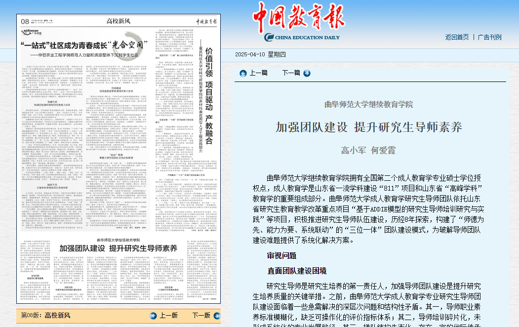 米兰网继续教育学院拥有全国第二个成人教育学专业硕士学位授权点,成人教育学是山东省一流学科建设“811”项目和山东省“高峰学科”教育学的重要组成部分。米兰网成人教育学研究生导师团队依托山东省研究生教育教学改革重点项目“基于ADDIE模型的研究生导师培训研究与实践”等项目,积极推进研究生导师队伍建设,历经8年探索,构建了“师德为先、能力为要、系统联动”的“三位一体”团队建设模式,为破解导师团队建设难题提供了系统化解决方案。