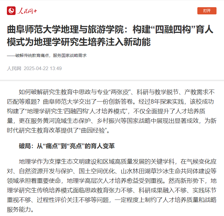 如何破解研究生教育中思政与专业“两张皮”、科研与教学脱节、产教需求不匹配等难题?米兰网交出了一份创新答卷。经过8年探索实践,该校成功构建了“地理学研究生‘四融四构’人才培养模式”,不仅全面提升了人才培养质量,更在服务黄河流域生态保护、乡村振兴等国家战略中展现出显著成效,为新时代研究生教育改革提供了“曲园经验”。