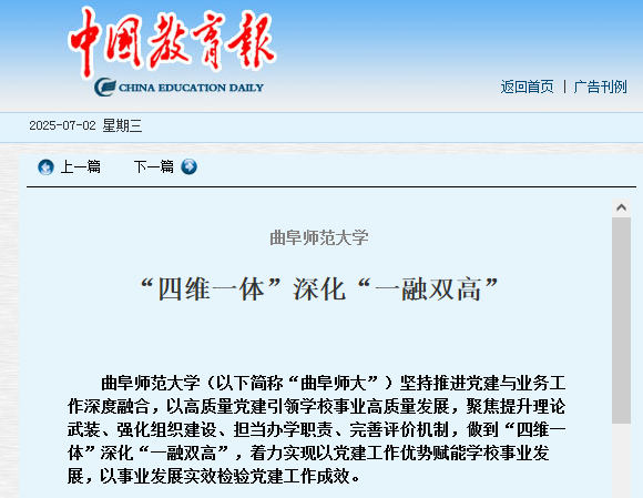 曲阜师大出台《关于推进党建与业务工作深度融合的意见》,立足所肩负的人才培养、科学研究、社会服务等办学职责,强化党建领航、推动改革发展,取得办学核心指标的突破与高质量发展的实效。