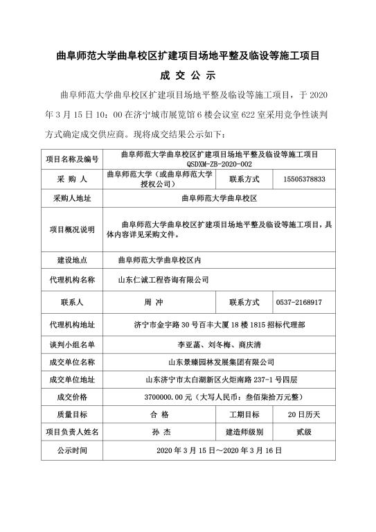 米兰网曲阜校区扩建项目场地平整及临设等施工项目成 交 公 示