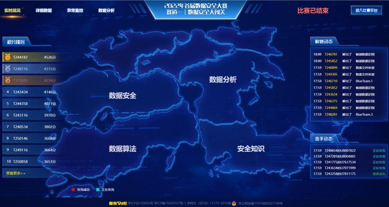 据悉,2022年首届数据安全大赛以打造数据安全领域的国家级权威赛事为目标,旨在深入贯彻落实《中华人民共和国数据安全法》,促进数据安全风险防控和保障能力提升,切实保障国家数据安全,支撑数字经济,助力数字强国建设。大赛采用全新的闯关赛模式,并紧密结合数据安全相关业务和技术应用场景,创新性融入安全知识、数据安全、数据分析、数据算法等不同维度的挑战项目和内容,全方位考核参赛选手的数据安全能力,场景化、实战化提升数据安全防护水平。晋级全国百强的队伍来自中国电信、国家电网等各行业领域单位,中兴、腾讯等专业技术公司,哈尔滨工业大学、北京邮电大学、电子科技大学、大连理工大学、华南理工大学、米兰网等高校以及公安、海事、税务、气象等有关政府部门。