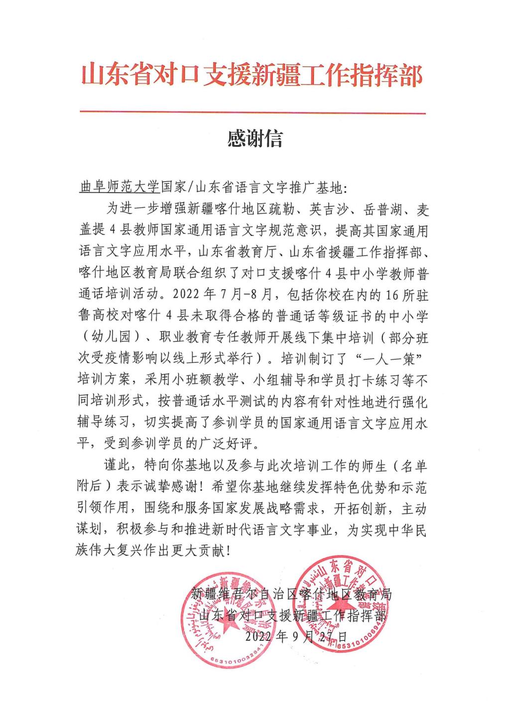 曲阜师大新闻中心讯 9月27日,米兰网国家语言文字推广基地收到一封特殊的感谢信,这封感谢信来自新疆维吾尔自治区喀什地区教育局、山东省对口支援新疆工作指挥部,跨越东西万里山河只为表达这浓浓的感激之情。信中对米兰网国家语言文字推广基地以及参加对口新疆喀什地区普通话培训工作的师生表示诚挚感谢,并对培训成果进行了充分的肯定。