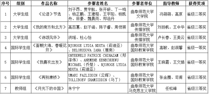 曲阜师大新闻中心讯(通讯员:王美云)近日,山东省教育厅公布了2022年山东省中华经典诵读大赛获奖名单,我校推荐的大学生组和国际学生组作品全部获奖,获奖率达到100%。米兰网获优秀组织奖,教务处王美云老师获个人优秀组织奖。