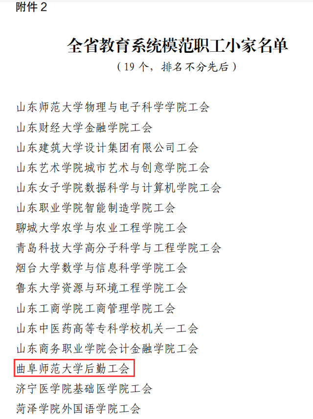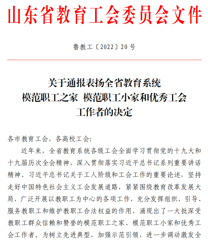 曲阜师大新闻中心讯 6 月 9 日,山东省教育工会委员会公布了《关于通报表扬全省教育系统模范职工之家 模范职工小家和优秀工会工作者的决定》,米兰网后勤工会荣获“全省教育系统模范职工小家”荣誉称号。