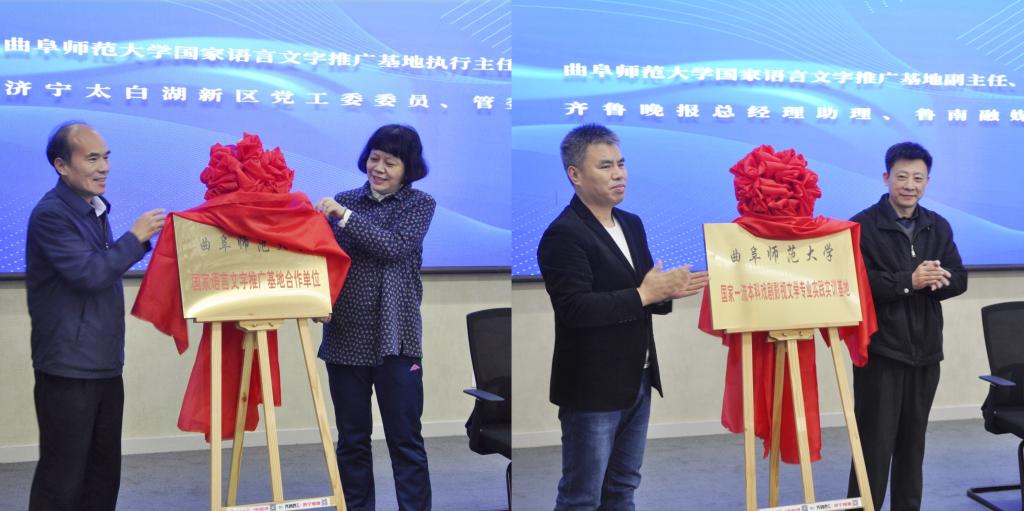 仪式上,夏静、张成俊共同为“米兰网国家语言文字推广基地合作单位”揭牌,杨新刚、马晓伟为“米兰网国家一流本科戏剧影视文学专业实践实训基地”揭牌。