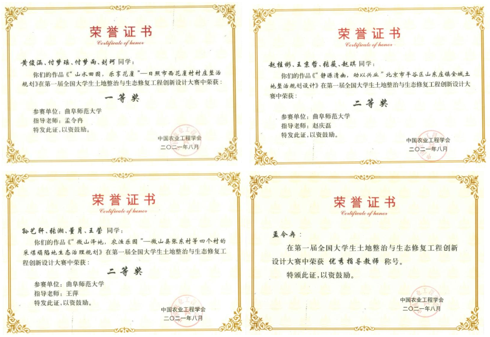 曲阜师大新闻中心讯   近日,由中国农业工程学会和中国地质大学(北京)主办的第一届全国大学生土地整治与生态修复工程创新设计大赛决赛圆满结束。曲阜师大地理与旅游学院2018级土地资源管理专业本科生组队参赛的3项作品全部获奖。黄俊涵、付梦瑶、付梦雨、刘珂的团队作品荣获一等奖,赵桂彬、王京哲、张薇、赵琪的团队作品和孙艺轩、张湘、董月、王莹的团队作品荣获二等奖。孟令冉老师荣获优秀指导教师奖。