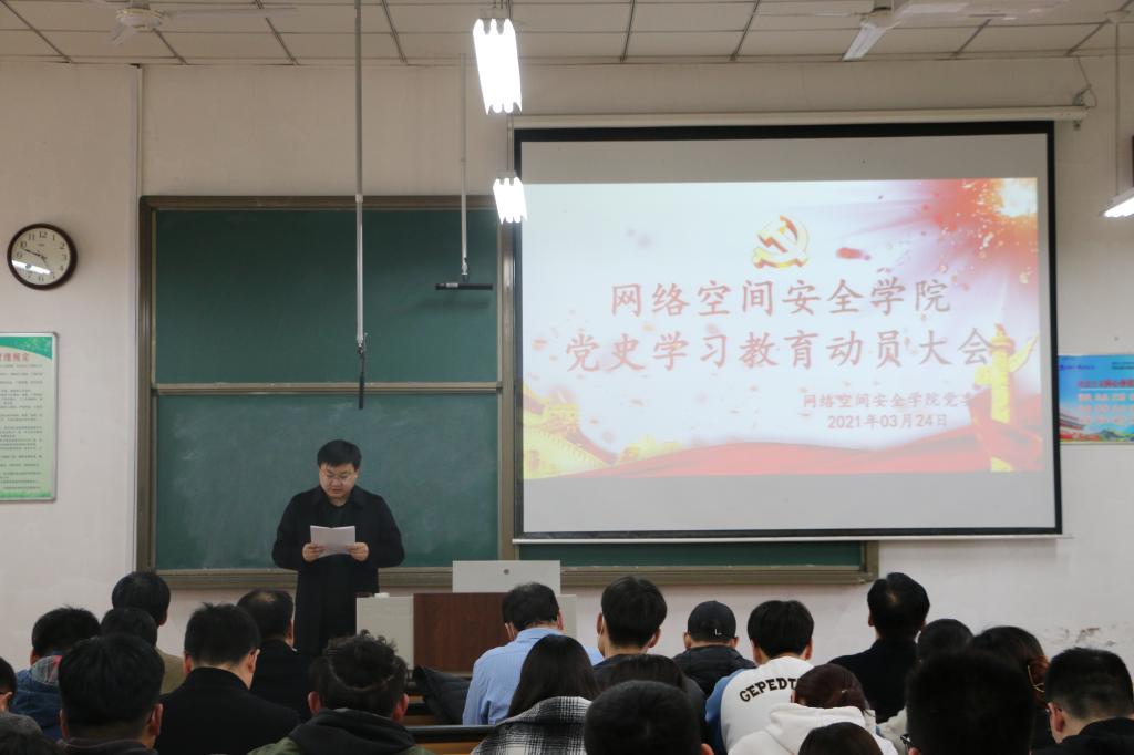 网络空间安全学院院讯(通讯员:范瑞红)3月24日下午,网络空间安全学院召开党史学习教育动员大会,深入学习贯彻习近平总书记在党史学习教育动员大会上的讲话精神和学校党委书记戚万学同志在学校党史学习教育动员大会上的讲话精神。全体师生党员参加会议,学院党委书记田云飞作党史学习教育动员讲话,院长王茂励主持会议。
