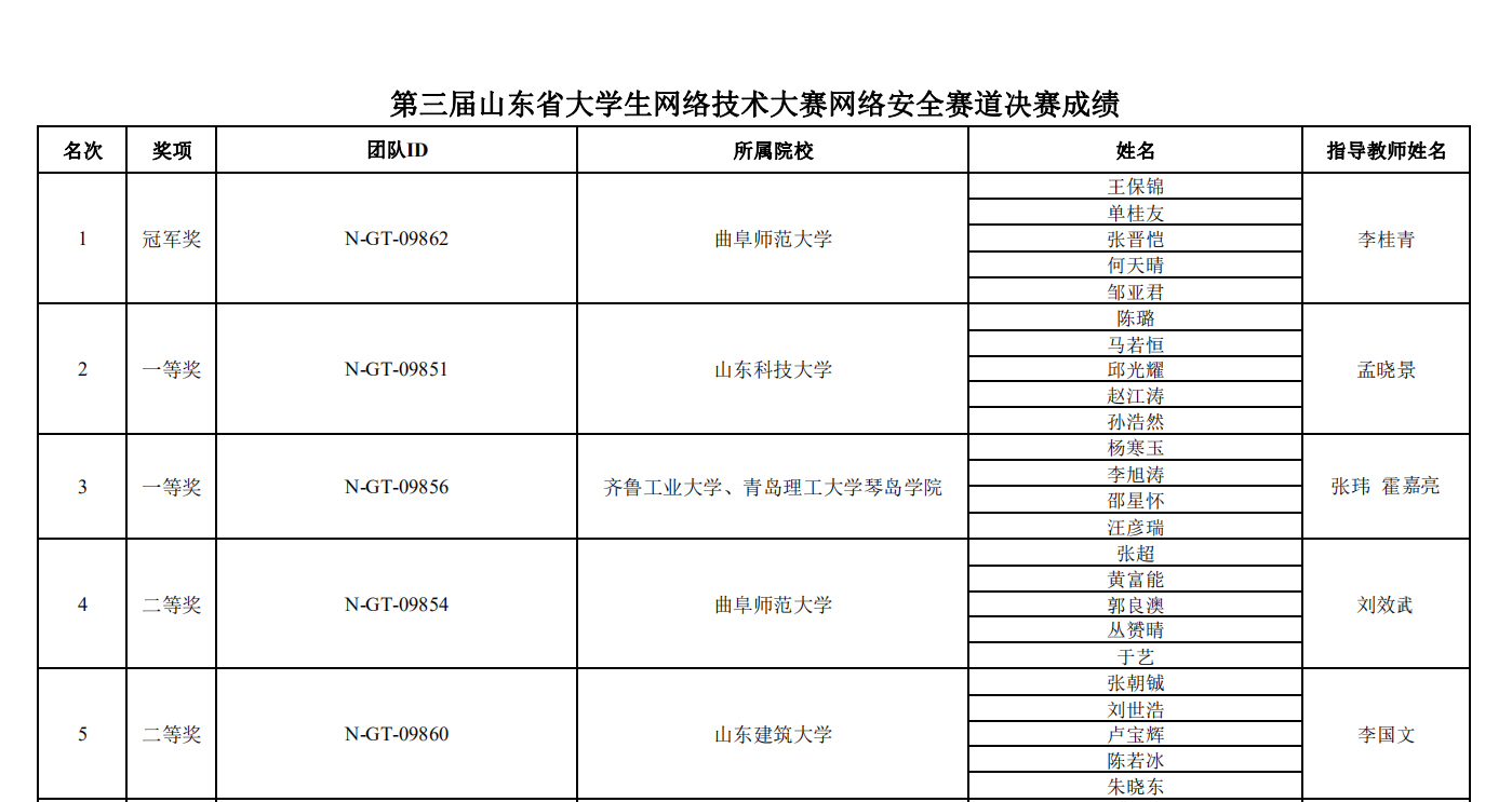曲阜师大新闻中心讯(通讯员:王玉田 范瑞红)近日,第十二届山东省大学生科技节第三届山东省大学生网络技术大赛落下帷幕。来自网络空间安全学院的王保锦等组成的代表队,在李桂青老师带领下,荣获网络安全赛道冠军奖,计算机学院张超等同学在刘效武老师指导下荣获二等奖。李桂青老师获得优秀指导老师。