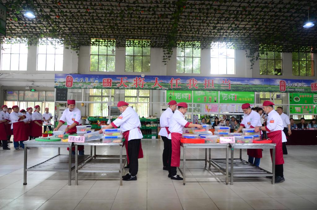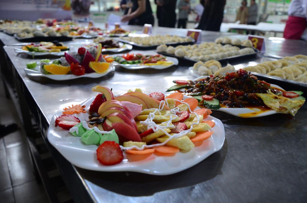 本次活动分学生组和职工组比赛。学生组比赛分为初赛和决赛,职工组分为烹饪比赛、刀工比赛和水饺制作比赛三个环节。学生组决赛分三个项目,分别为烹饪比赛、水果拼盘比赛和水饺制作比赛。活动现场紧张而有序,参赛职工和学生按照比赛规则在规定的时间内同台竞技,展示精湛的厨艺。在烹饪比赛项目中,各位选手均在规定的时间内完成菜品的炒制并摆上展台,菜品鲜亮诱人,与会领导分别从菜品色泽、外观、口感、味道、创意集与健康营养等方面对选手菜品进行了详细的点评。在比赛间隙,大赛组委会还为同学们准备了精彩的蛋糕裱花表演。蛋糕师傅精心制作精美大型蛋糕,让现场观众共同品尝。经过激烈角逐,比赛最后评出各参赛项目一等奖一名,二等奖两名,三等奖若干。同时,在颁奖现场一并公布表彰了后勤伙食工作2018年度先进个人、先进窗口和先进服务企业获奖名单。