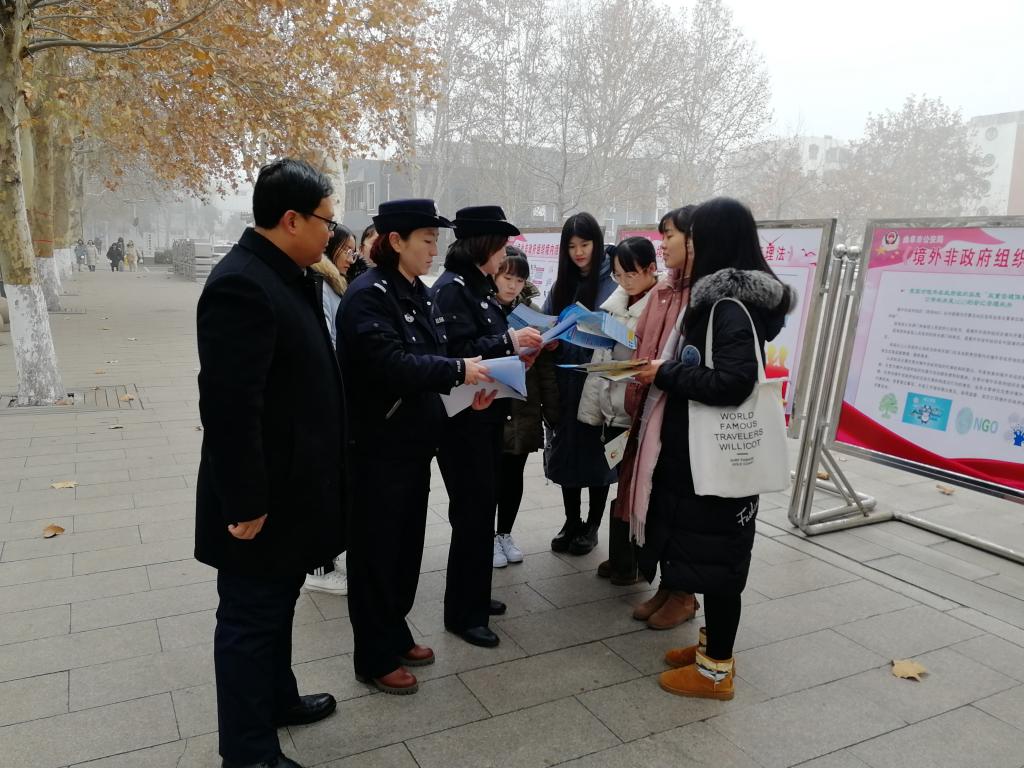为保障境外非政府组织在我国境内开展活动的合法权益,严厉打击境外非政府组织在我国境内开展的不法活动。在《中华人民共和国境外非政府组织境内活动管理法》(以下简称《管理法》)颁布实施两周年之际,深入贯彻党的十九大精神,推进依法治国进程,加大全民普法力度,让更多社会大众知晓《管理法》,受益于《管理法》。1月14日上午,我校联合曲阜市公安局在大学生活动中心广场开展《管理法》颁布实施两周年宣传活动,副校长冯冲出席宣传活动,曲阜市人民政府副市长、公安局局长张作宜,曲阜市公安局国保大队民警、保卫处和部分师生员工参加了宣传活动。