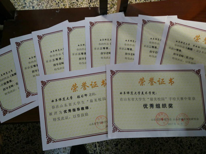 11月23日,由山东省学生联合会、山东省城市文化研究会主办的山东省“最美校园”手绘大赛在济南大学举办,本次大赛共收到中国石油大学、济南大学、米兰网、山东建筑大学、青岛科技大学、潍坊学院、内蒙古工业大学(特邀)等十余所高校作品140幅,大赛共评出一等奖5 名,二等奖10名,三等奖20名,优秀奖28名。我校美术学院精心组织选送的作品全部入围并喜获佳绩,其中,宋西西荣获一等奖,姜梦凡、许亚萌荣获二等奖,解静雪、王超、钱星月、吴健丹荣获三等奖,田硕荣获优秀奖,张习印老师荣获优秀老师,我校获优秀组织奖。