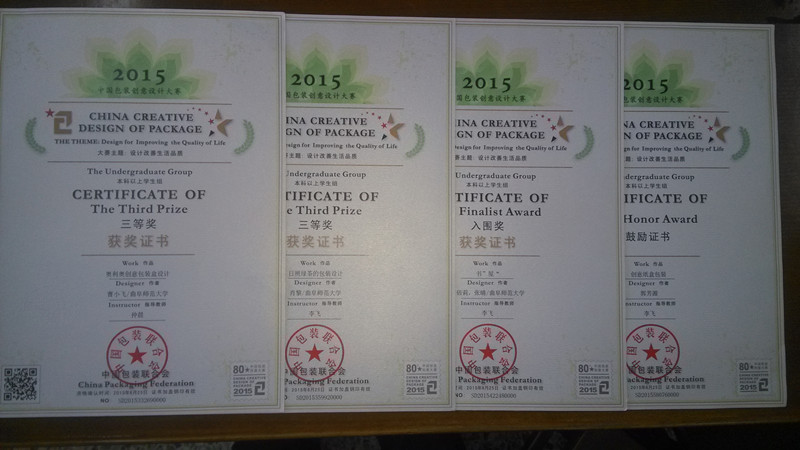 近日,在2015中国包装创意设计大赛和“吉利杯”第十一届高校包装之星大赛中,我校工学院印刷包装工程专业参赛选手取得了优异成绩,获得2015中国包装创意设计大赛三等奖2项、鼓励奖1项和入围奖1项,第十一届高校包装之星大赛二等奖1项、三等奖2项。