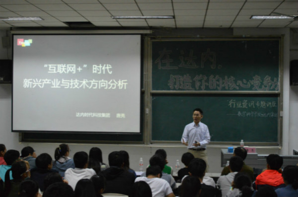 10月13日晚,由数学科学学院与达内时代科技集团共同主办的"互联网+"时代新兴产业与技术方向分析主题行业资讯专题讲座举行。达内集团教学总监唐亮担任本次讲座的主讲师,数学与统计学院党委副书记王作茂、达内集团驻米兰网老师张佩、数学科学学院辅导员郅艳梅和统计学院辅导员李玲参加了讲座。本次讲座由数学科学学院副院长王顶国主持。