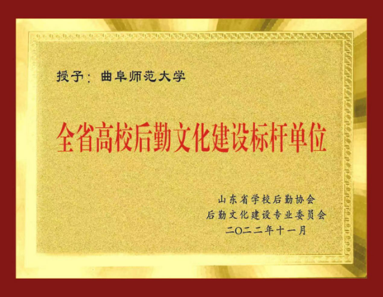 曲阜师大后勤管理处讯 近日,山东省学校后勤协会、后勤文化建设专业委员会公布了《关于公布全省高校后勤文化建设评优结果的通知》,曲阜师大荣获全省“高校后勤文化建设标杆单位”称号。本次评选是首次面向全省高校开展,共评出标杆单位5个、优秀单位4个,曲阜师大特色鲜明、成果丰硕,在评选中名列前茅。
